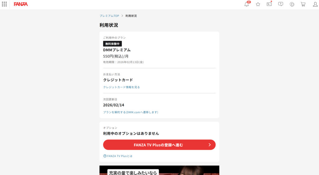 ログイン後、DMMプレミアムの利用状況ページを開くと、現在のプランが「無料体験中」かどうか、次回の更新日がいつなのかが確認できます。この画面に「プランを解約する」というリンクが表示されていれば、すでに解約手続きに進める状態です。