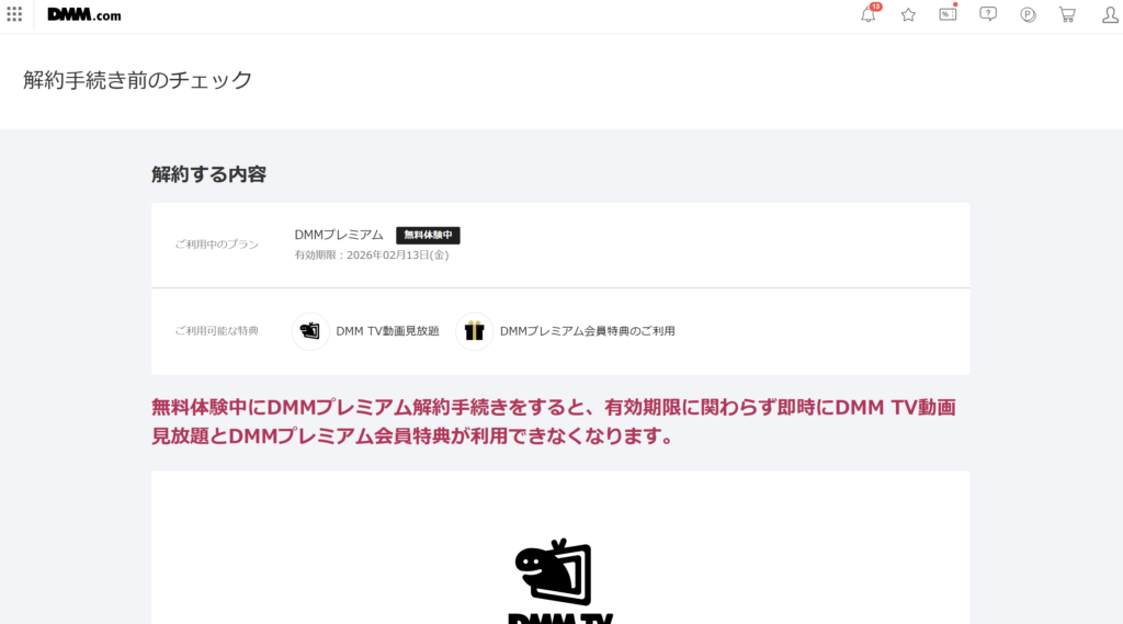 実際に解約手続きを進めると、無料期間が残っていても、その時点でDMM TVの見放題やDMMプレミアムの会員特典は利用できなくなります。無料期間の終了日まで使い切れる、という仕組みではありません。
